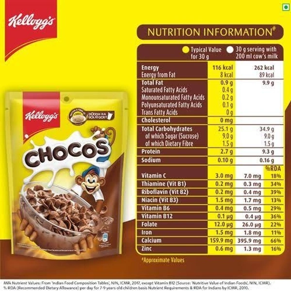 Kellogg's Chocos, with Protein & Fibre of 1 Roti* in Each Bowl**, High in Calcium & Protein, with 10 Essential Vitamins & Minerals, Breakfast Cereals